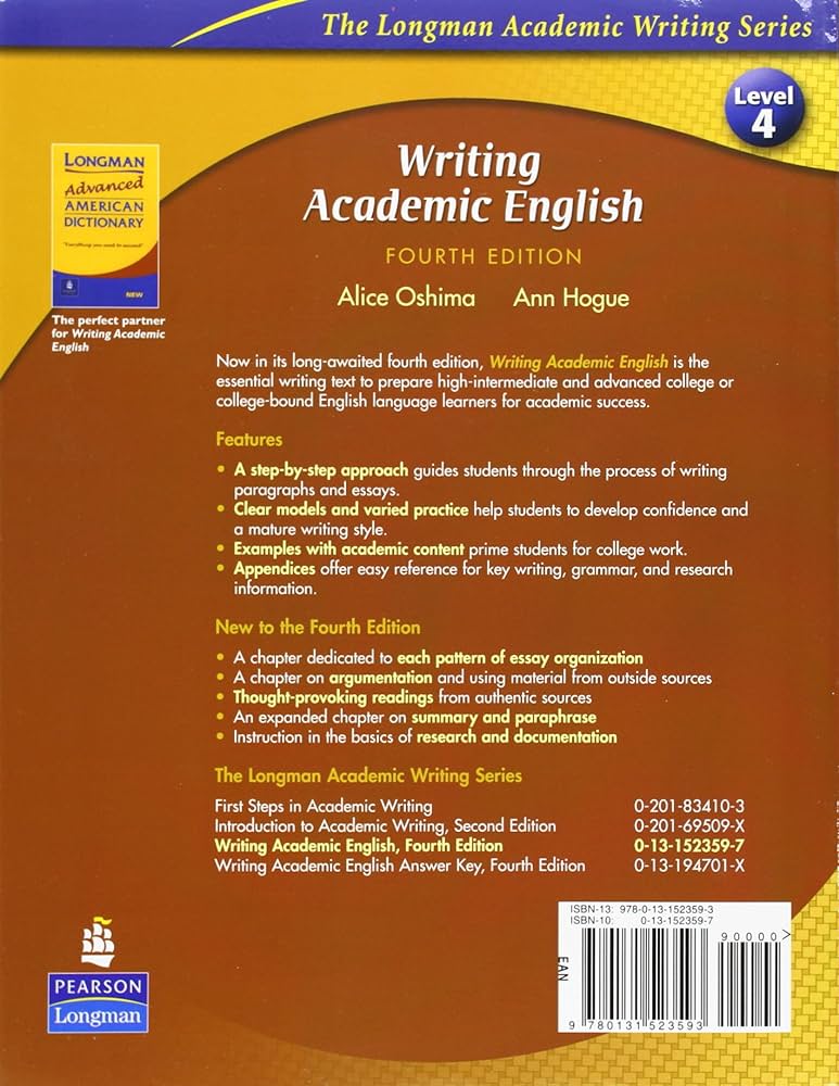 หนังสือ "การเขียนภาษาอังกฤษเชิงวิชาการ" ฉบับที่ 4 เป็นตำราเรียนที่ครอคลุมออกแบบมาเพื่อช่วยให้นักเรียนเชี่ยวชาญทักษะการเขียนเชิงวิชาการ เหมาะอย่างยิ่งสำหรับผู้เรียนภาษาอังกฤษเป็นภาษาที่สอง (ESL) ที่ต้องการความคล่องแคล่วในการเขียนอย่างมีโครงสร้างและเป็นทางการ