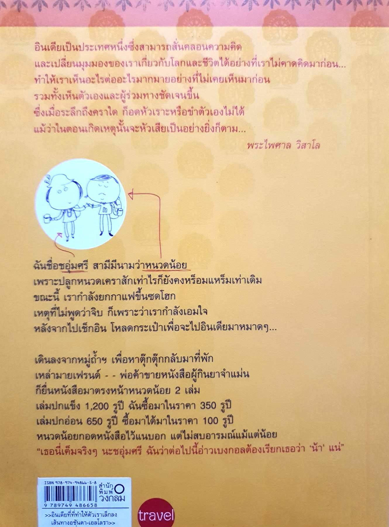 อินเดียเป็นประเทศหนึ่งซึ่งสามารถสั่นตลอนความคิดและเปลี่ยนมุมมองของเราเกี่ยวกับโลกและชีวิตได้อย่างที่เราไม่คาดคิดมาก่อนทำให้เราเห็นตัว เองและผู้ร่วมทางชัดเจนขึ้นซึ่งเมื่อระลึกถึงคราใด ก็อดหัวเราะหรือขำตัวเองไม่ได้แม้ว่าในตอนเกิดเหตุนั้นจะหัวเสียเป็นอย่างยิ่งก็ตาม...