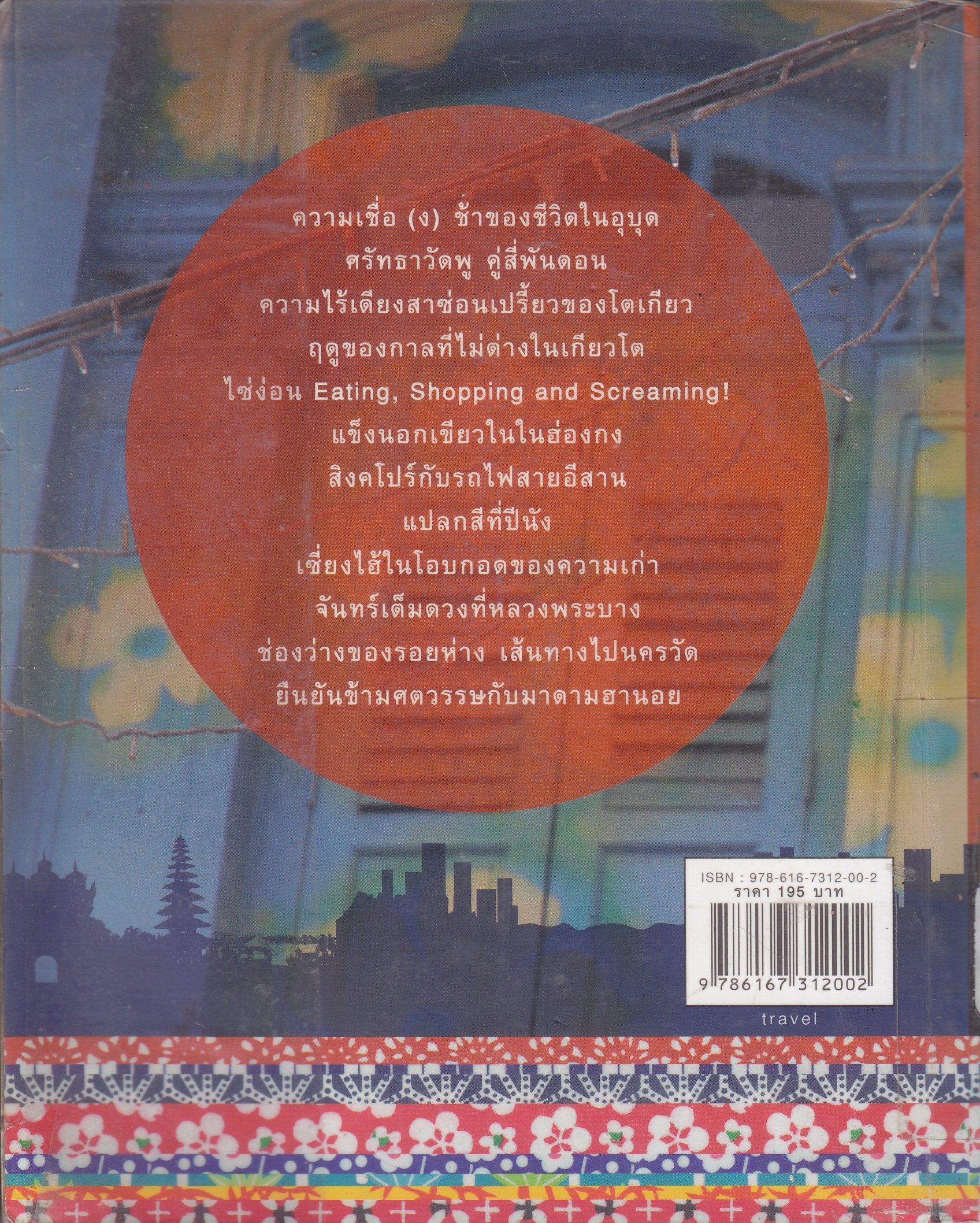 ความเชื่องช้าของชีวิตในอุบุดศรัทธาวัดพู คู่สี่พันดอนความไร้เดียงสาซ่อนเปรี้ยวของโตเกียวฤดูของกาลที่ไม่ต่างในเกียวโตไซ่ง่อน Eating, shopping and Screaming! แข็งนอกเขียวในในฮ่องกงสิงคร์กับรถไฟสายอีสานแปลกสีที่ปีนังเซี่ยงไฮ้ในโอฐกอดของความเก่าจันทร์เต็มดวง ที่หลวงพระบางช่องว่างของรอยห่าง เส้นทางไปนครวัดยืนยันข้ามศตวรรษกับมาดามฮานอย