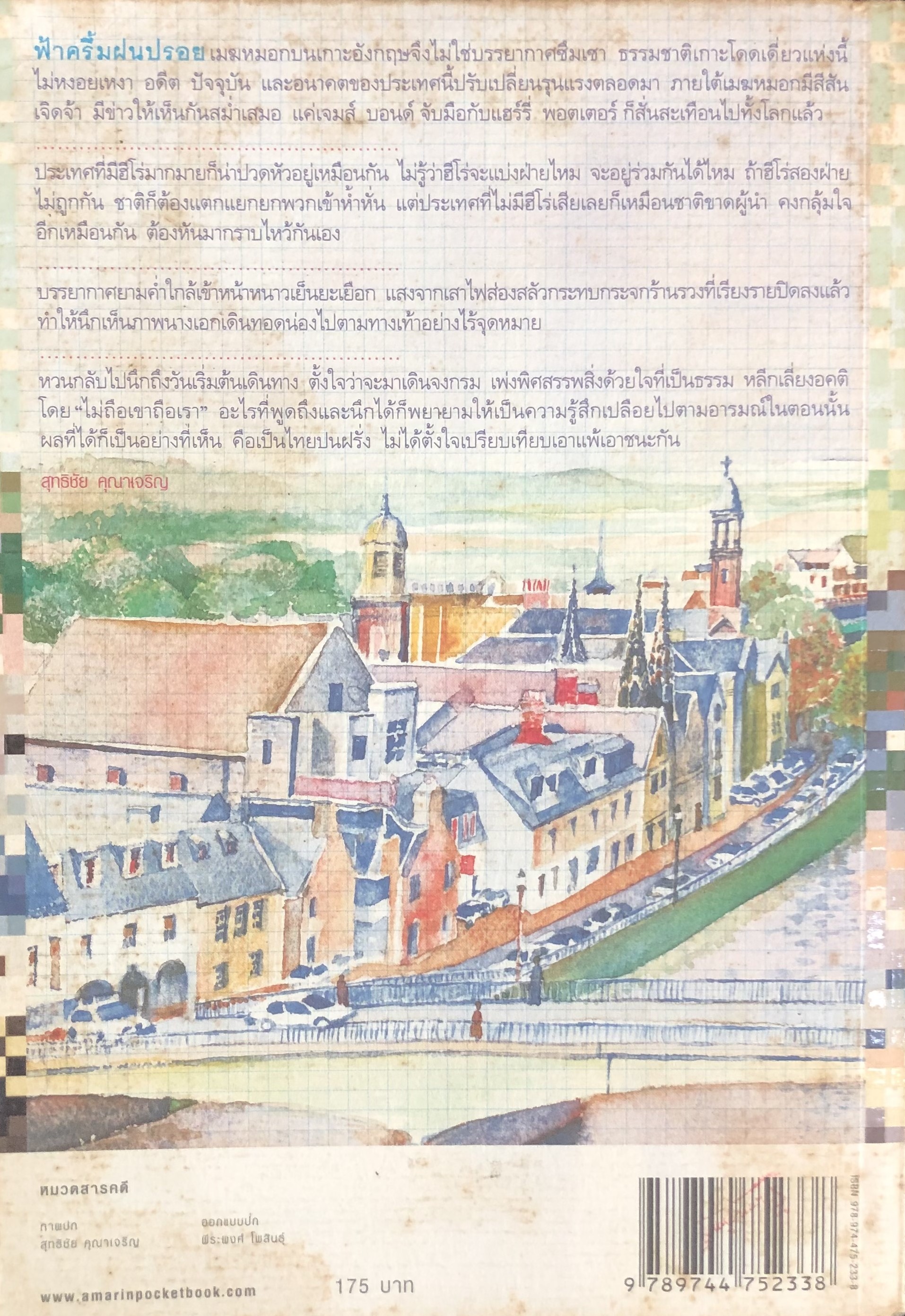 ฟ้าครึ้มฝนปรอยเมฆหมอกบนเกาะอังกฤษจึงไม่ใช่บรรยากาศซึมเซา ธรรมชาติเกาะโดดเดี่ยวแห่งนี้ไม่หงอยเหงา อดีต ปัจจุบัน และอนาคตของประเทศนี้ปรับเปลี่ยนรุนแรงตลอดมา ภายใต้เมฆหมอกมีสีสันเจิดจ้า มีข่าวให้เห็นกันสม่ำเสมอ แค่เจมส์ บอนด์ จับมือกับแฮร์รี่ พอตเตอร์ก็สั่นสะเทือนไปทั้งโลกแล้ว ประเทศที่มีฮีโร่มากมายก็น่าปวดหัวอยู่เหมือนกันไม่รู้ว่าฮีโร่จะแบ่งฝ่ายไหมจะอยู่ร่วมกันได้ไหมถ้าฮีโร่สองฝ่ายไม่ถูกกัน ชาติก็ต้องแตกแยกพวกเขาห่ำหั่น แต่ประเทศที่ไม่มีฮีโร่เสียเลยก็เหมือนชาติขาดผู้นำคงกลุ้มใจอีกเหมือนกัน ต้องหันมากราบไหว้กันเอง บรรยากาศยามค่ำใกล้เข้าหน้าหนาวเย็นยะเยือก แสงจากเสาไฟส่องสลัวกระทบกระจกร้านรวงที่เรียงรายปิดลงแล้วทำให้นึกเห็นภาพนางเอกเดินทอดน่องไปตามทางเท้าอย่างไร้จุดหาย หวนกลับไปนึกถึงวันเริ่มต้นเดินทาง ตั้งใจว่าจะมาเดินจงกรม เพ่งพิศสรรพสิ่งด้วยใจที่เป็นธรรม หลีกเลี่ยงคติโดย"ไม่ถือเขาถือเรา"อะไรที่พูดถึงและนึกได้พยายามให้เป็นความรู้สึกเปลือยไปตามอารณ์ในตอนนั้นผลที่ได้ก็เป็นอย่างที่เห็น คือเป็นไทยปนฝรั่ง ไม่ได้ตั้งใจเปรียบเทียบเอาแพ้เอาชนะกัน
