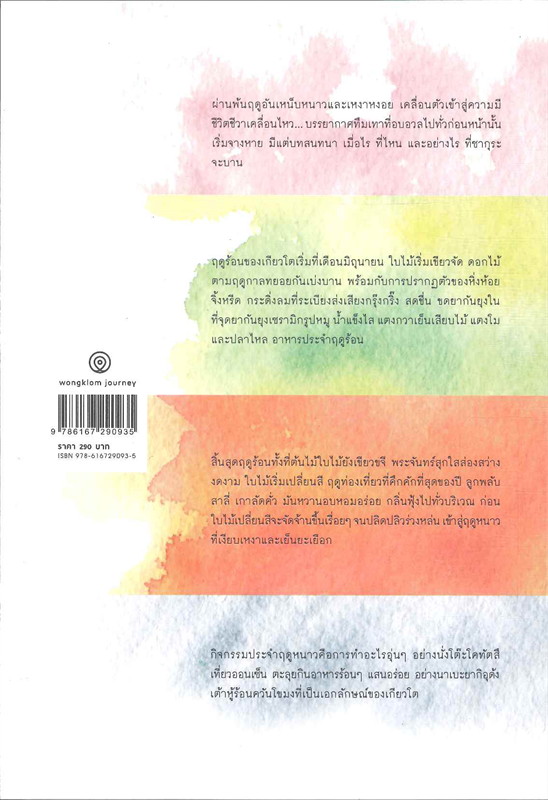ฤดูร้อนของเกียวโตเริ่มที่เดือนมิถุนายน ใบไม้เริ่มเขียวจัด ดอกไม้ตามฤดูกาลทยอยกันเบ่งบาน พร้อมกับการปรากฏตัวของหิ่งห้อย จิ้งหรีด กระดิ่งลมที่ระเบียงส่งเสียงกรุ๊งกริ้ง สดชื่น ขดยากันยุงใน ที่จุดยากันยุงเซรามิกรูปหมู น้ําแข็งไส แตงกวาเย็นเสียบไม้ แตงโม และปลาไหล อาหารประจําฤดูร้อน สิ้นสุดฤดูร้อนทั้งที่ต้นไม้ใบไม้ยังเขียวขจี พระจันทร์สุกใสส่องสว่าง งดงาม